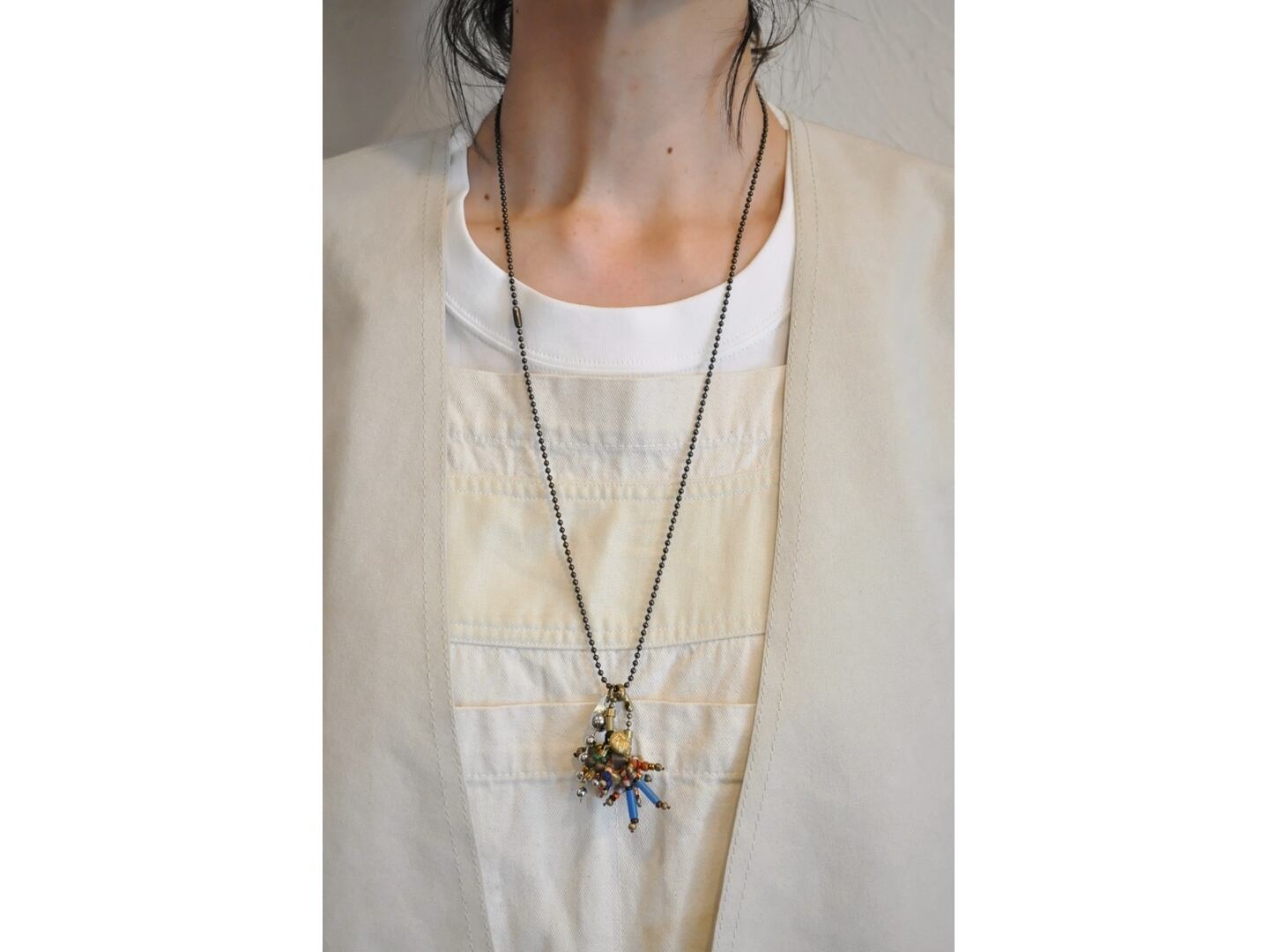 ヴィンテージのビーズやボタン、メタルパーツなどの色々な素材を組み合わせた存在感のある一点物のネックレス。