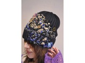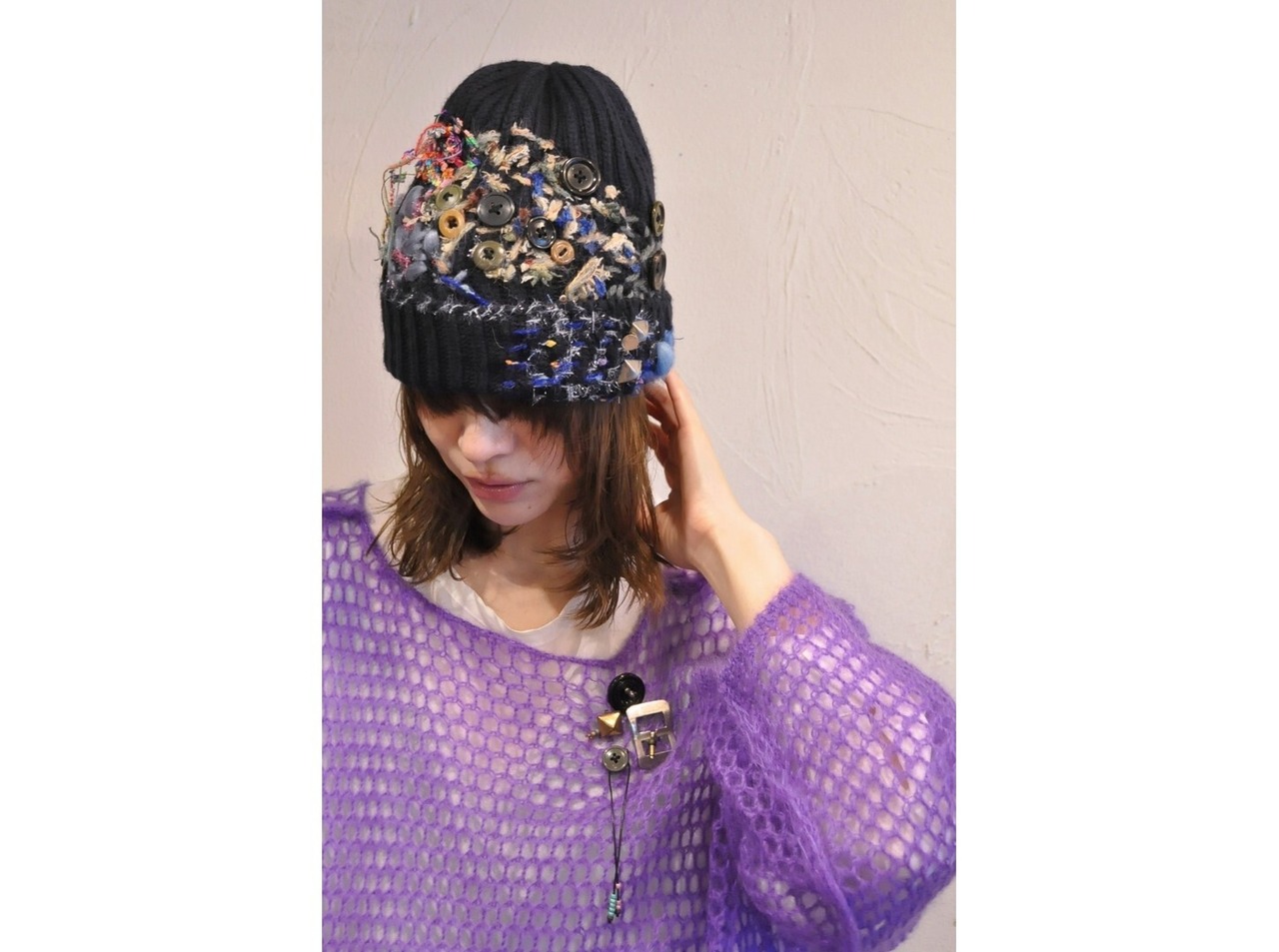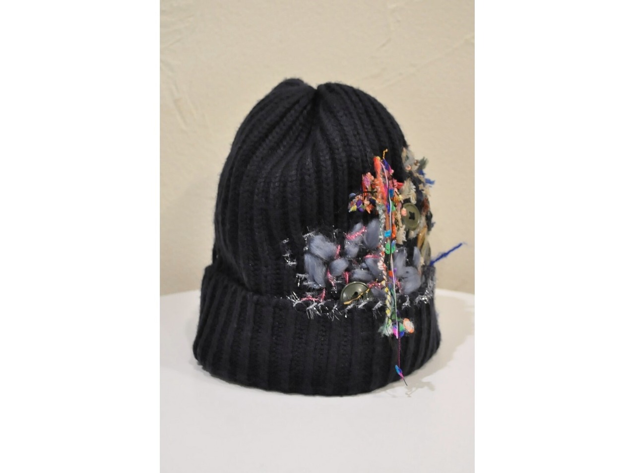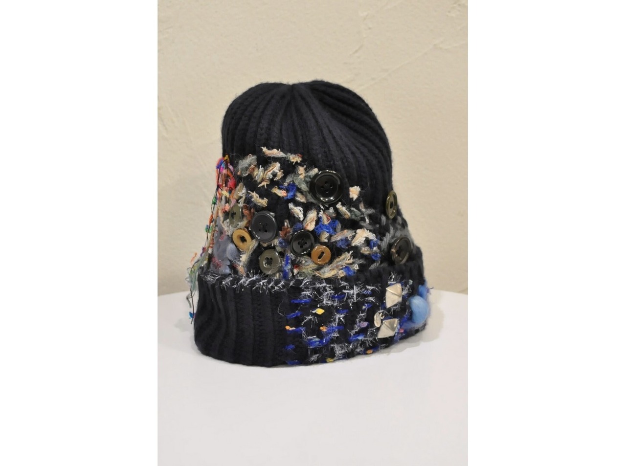 ベーシックなニット帽に、手の込んだ刺繍やヴィンテージボタンで装飾を施し、カスタムしたアイテム。