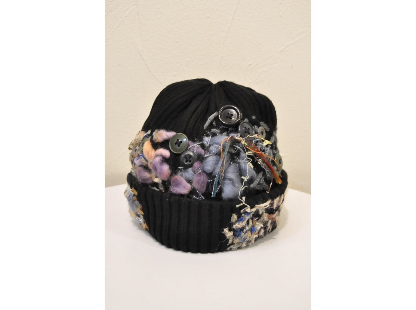 ベーシックなニット帽に、手の込んだ刺繍やヴィンテージボタンで装飾を施し、カスタムしたアイテム。
