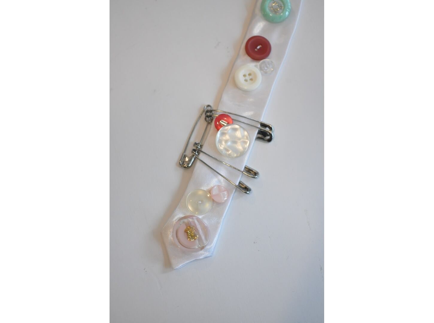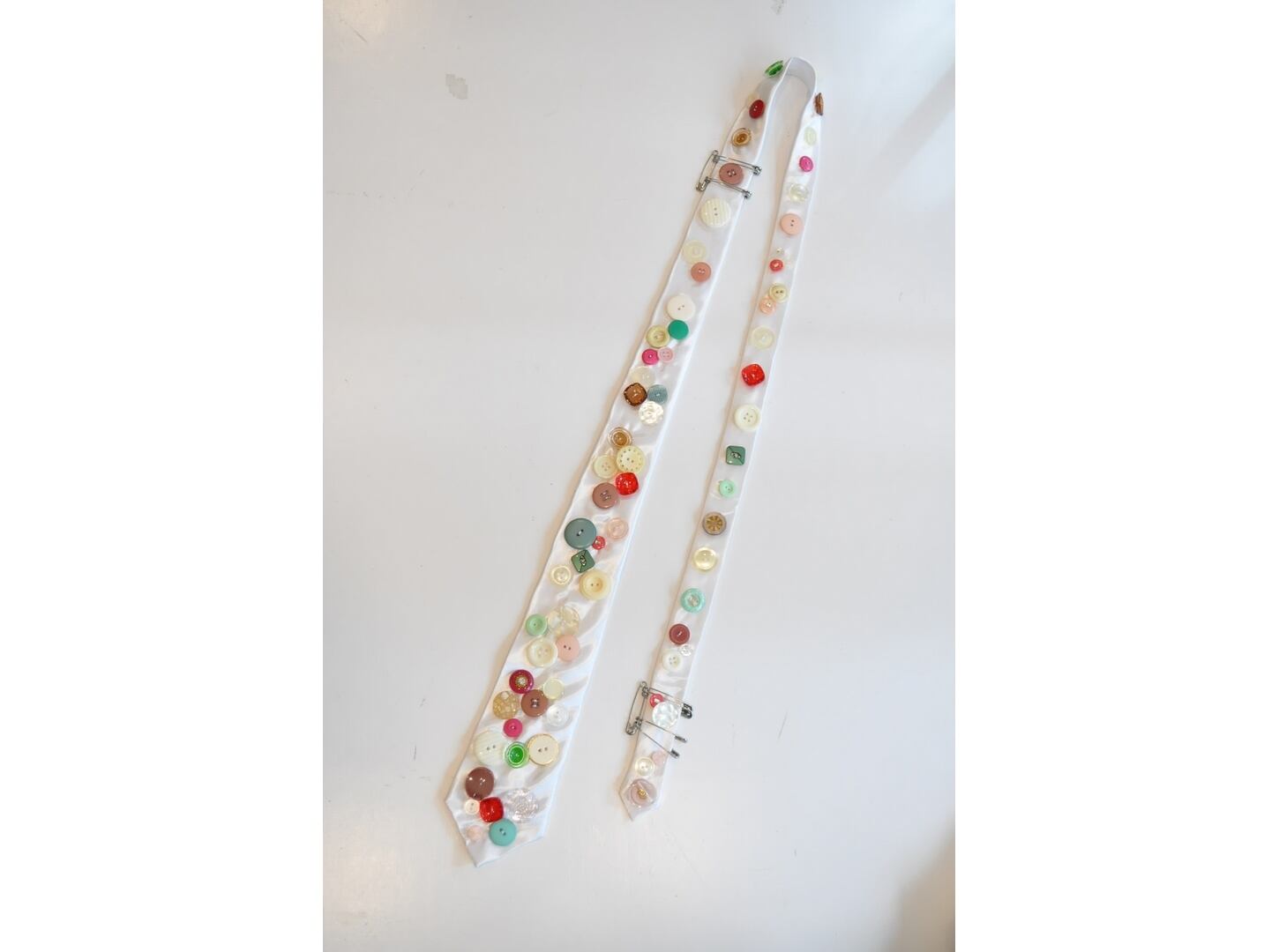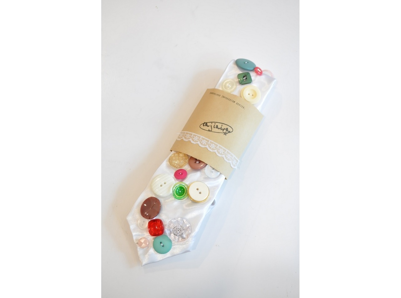 ヴィンテージやミリタリーのボタンなど様々なパーツを贅沢に、且つ、ふんだんに散りばめた一点物のネクタイ。