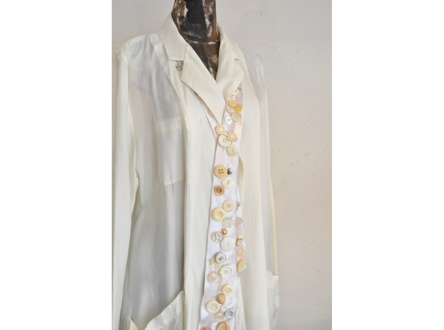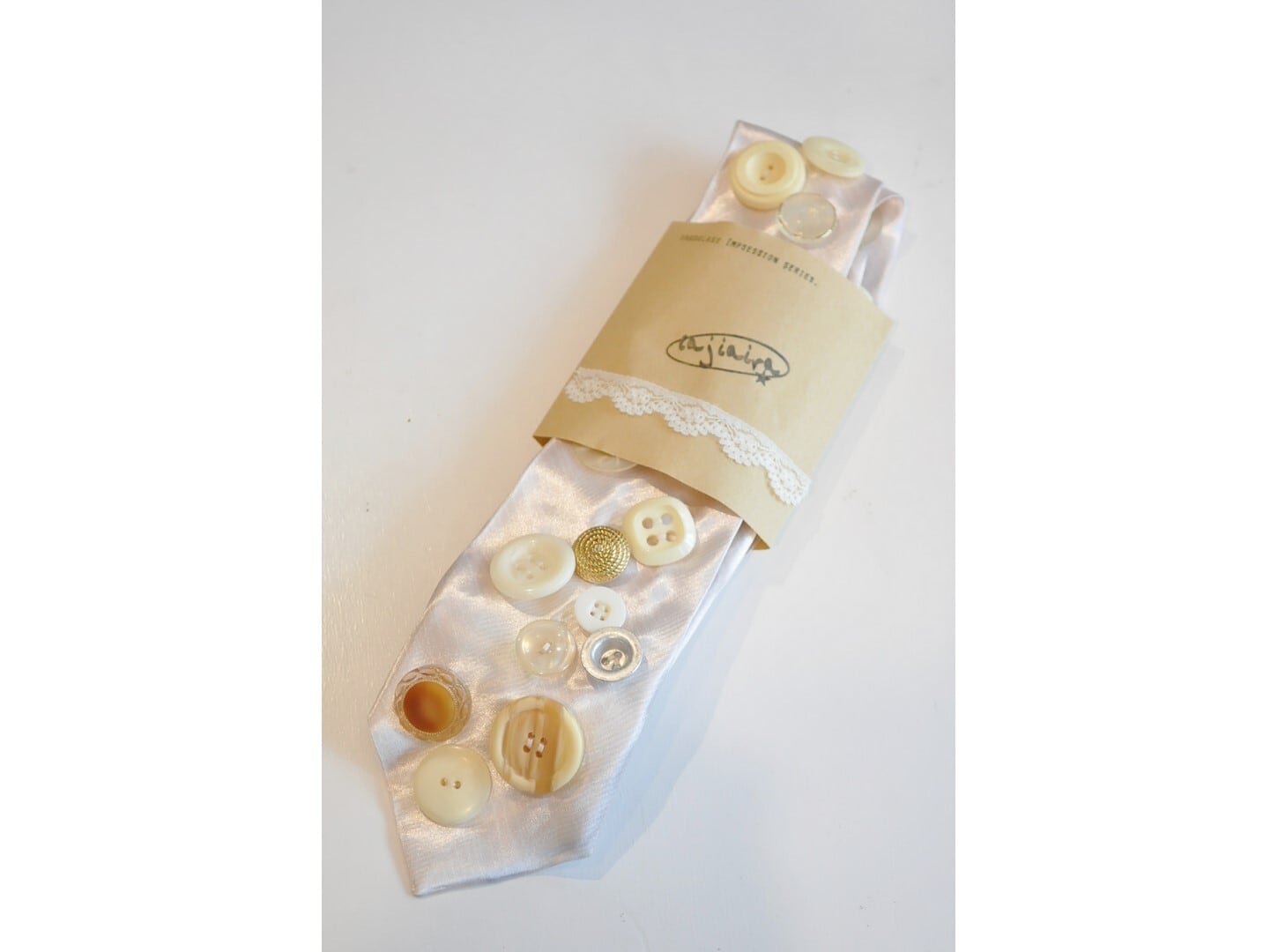 ヴィンテージやミリタリーのボタンなど様々なパーツを贅沢に、且つ、ふんだんに散りばめた一点物のネクタイ。