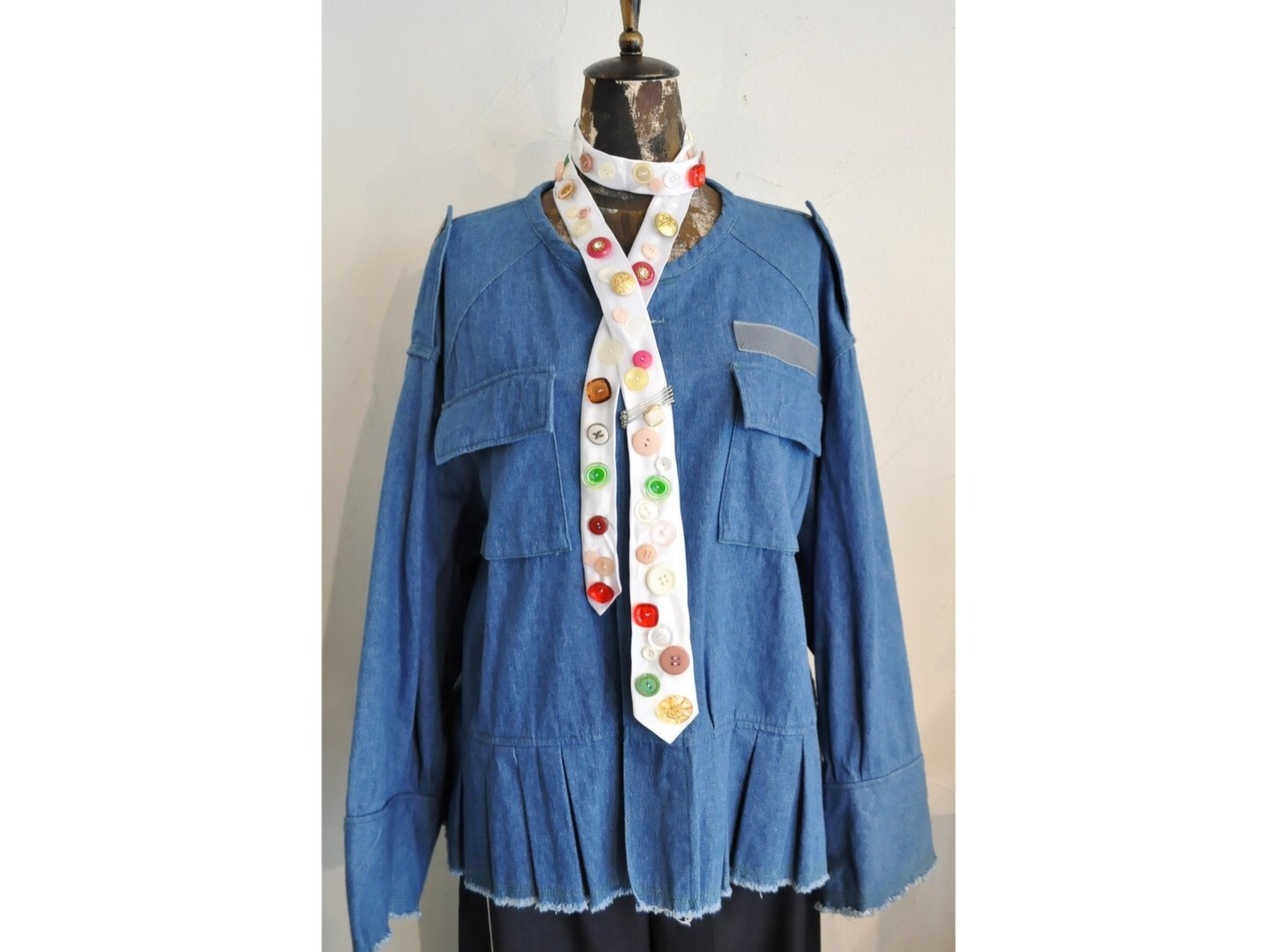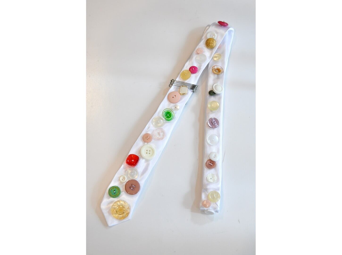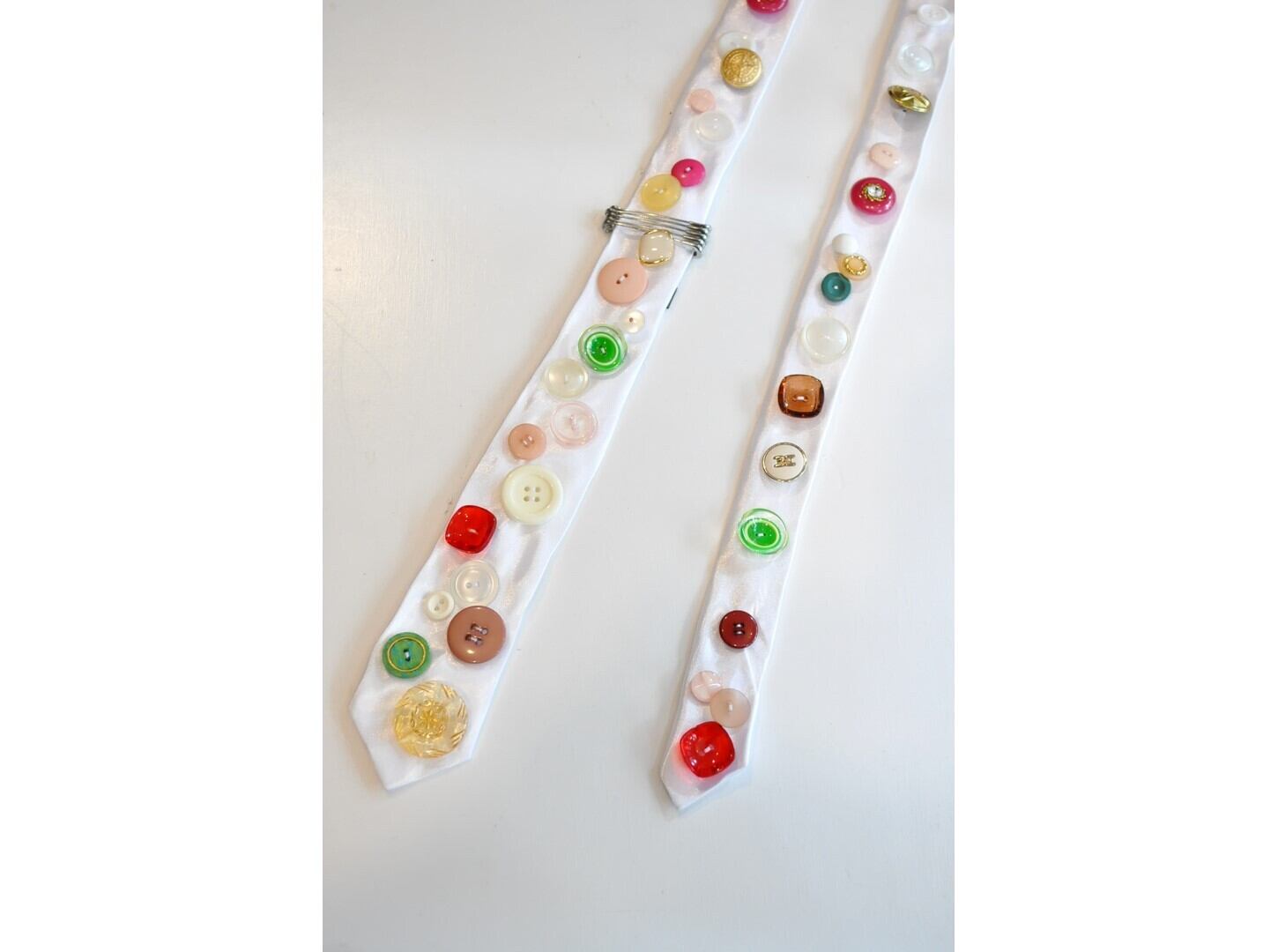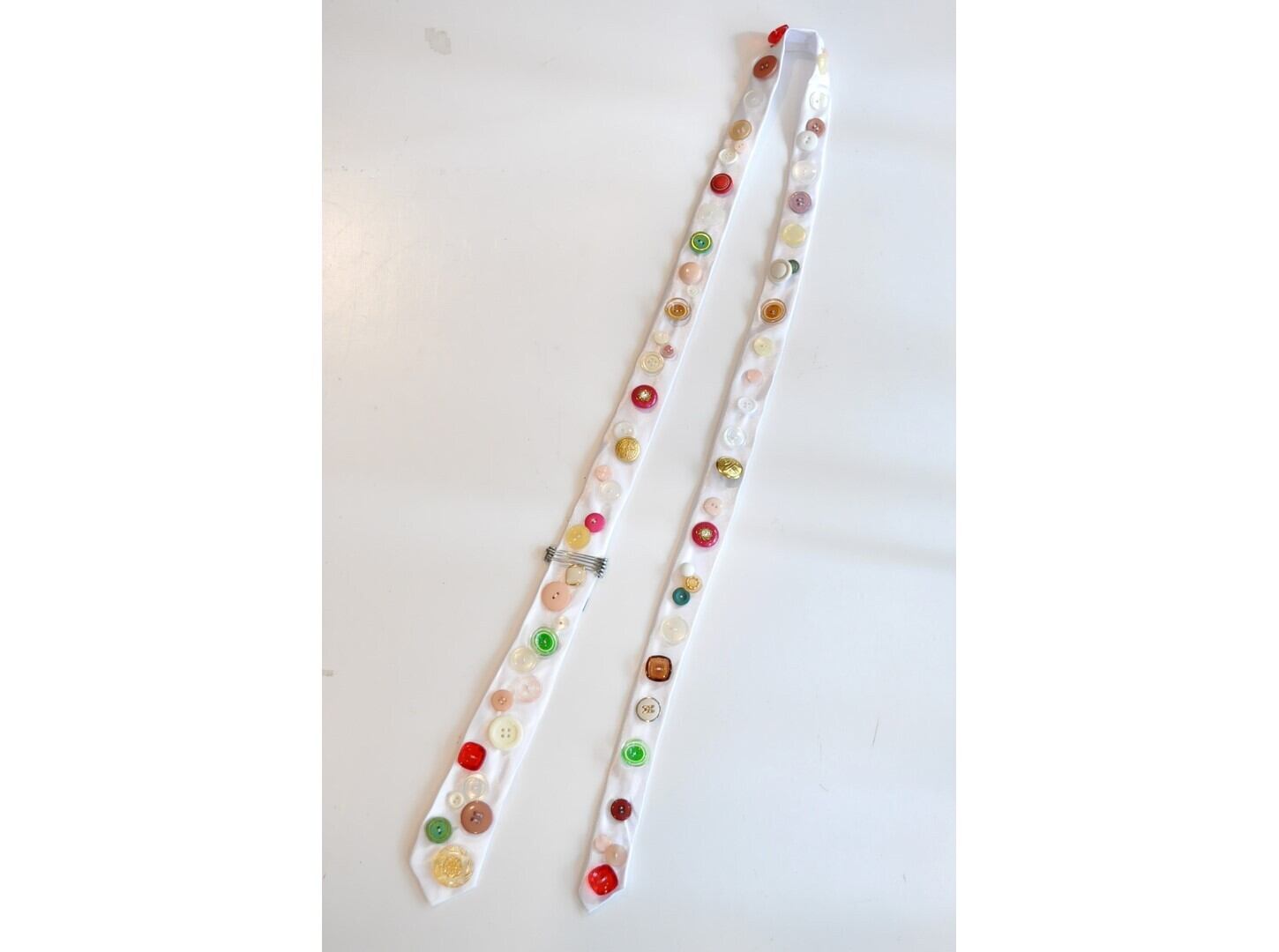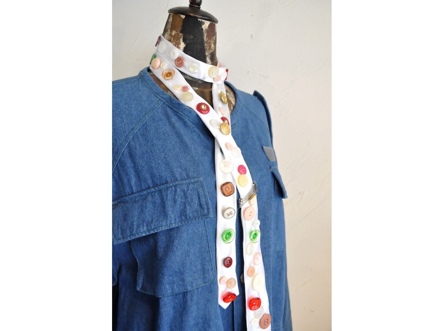 ヴィンテージやミリタリーのボタンなど様々なパーツを贅沢に、且つ、ふんだんに散りばめた一点物のネクタイ。