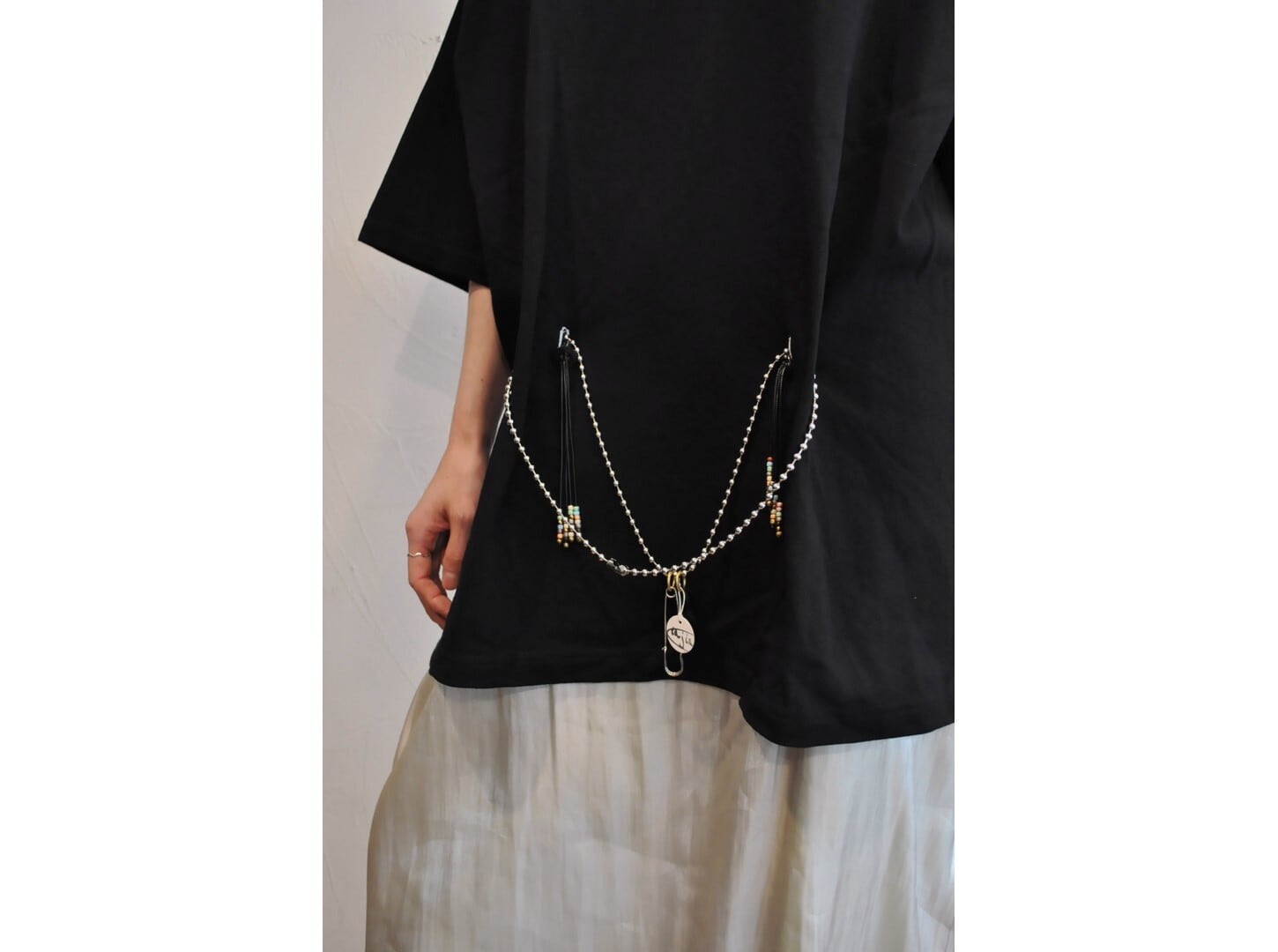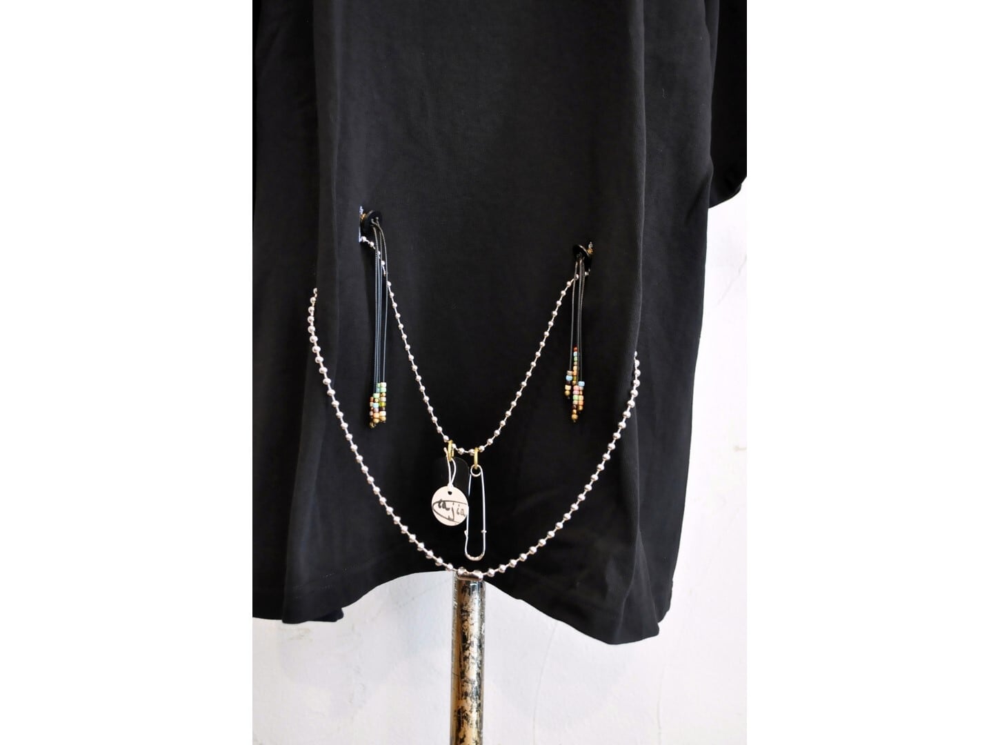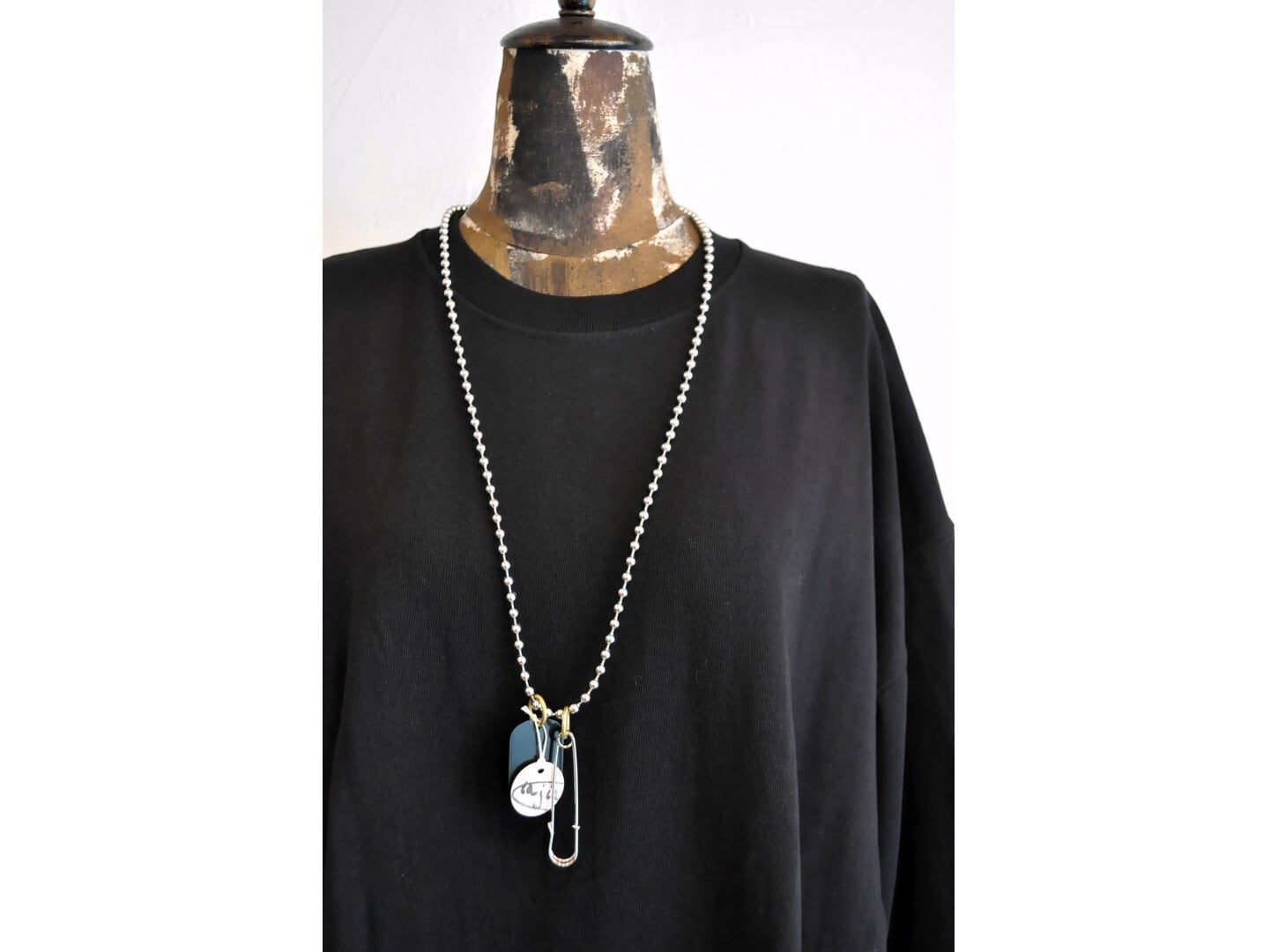 付属に着脱可能な、ヴィンテージのボタンとビーズ等の素材を組み合わせたパーツとボールチェーンが付いており、付け方を変えて色々な着方やアレンジが楽しめます。