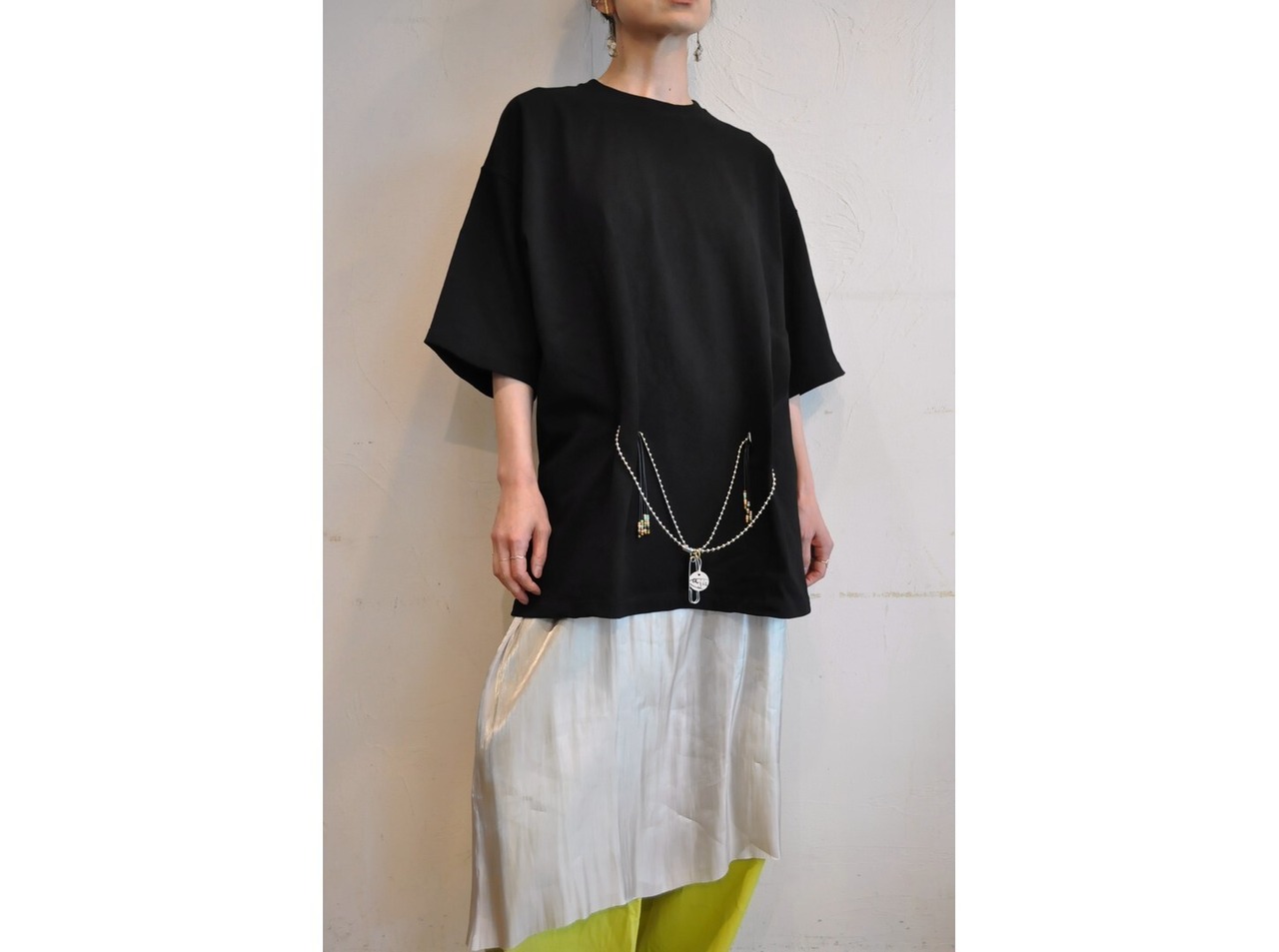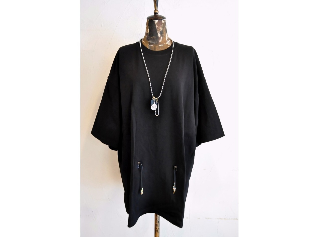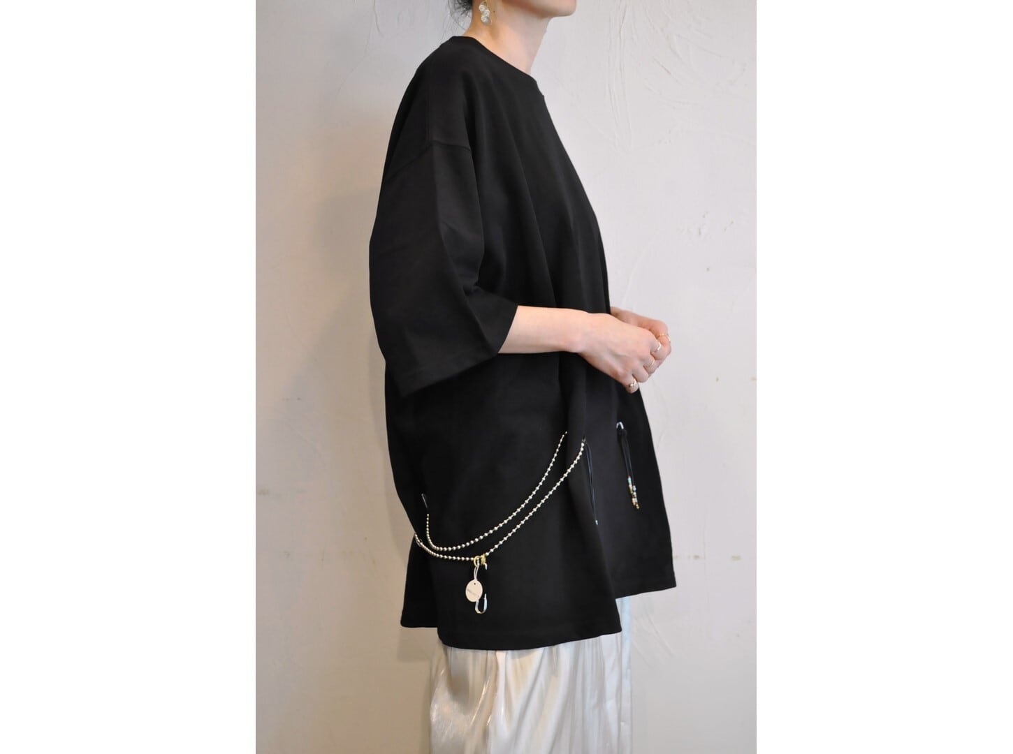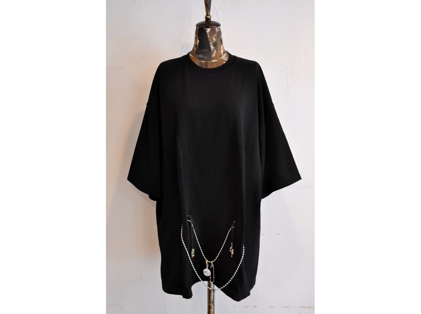付属に着脱可能な、ヴィンテージのボタンとビーズ等の素材を組み合わせたパーツとボールチェーンが付いており、付け方を変えて色々な着方やアレンジが楽しめます。