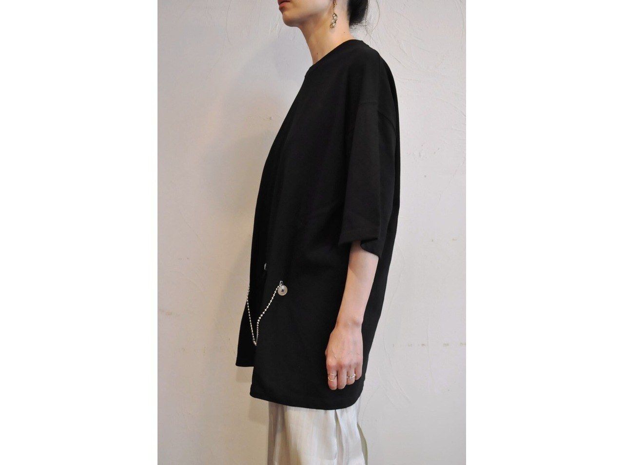 フロントに2つ・バックに1つ、大きなボタンホールを施したビッグTシャツ。