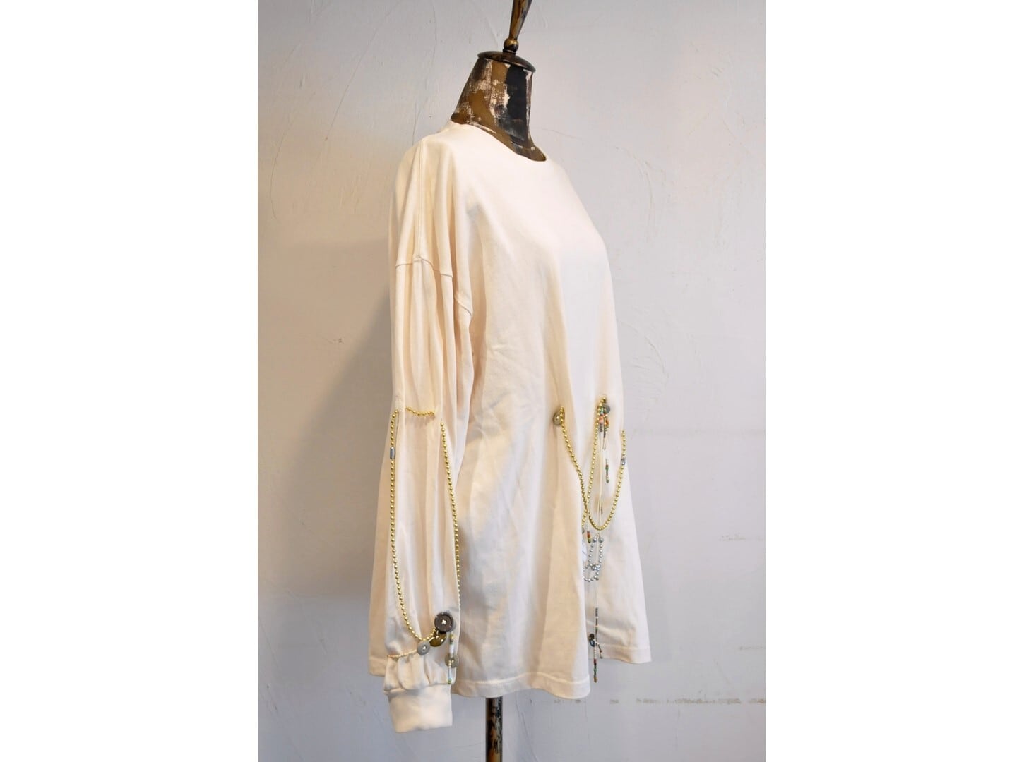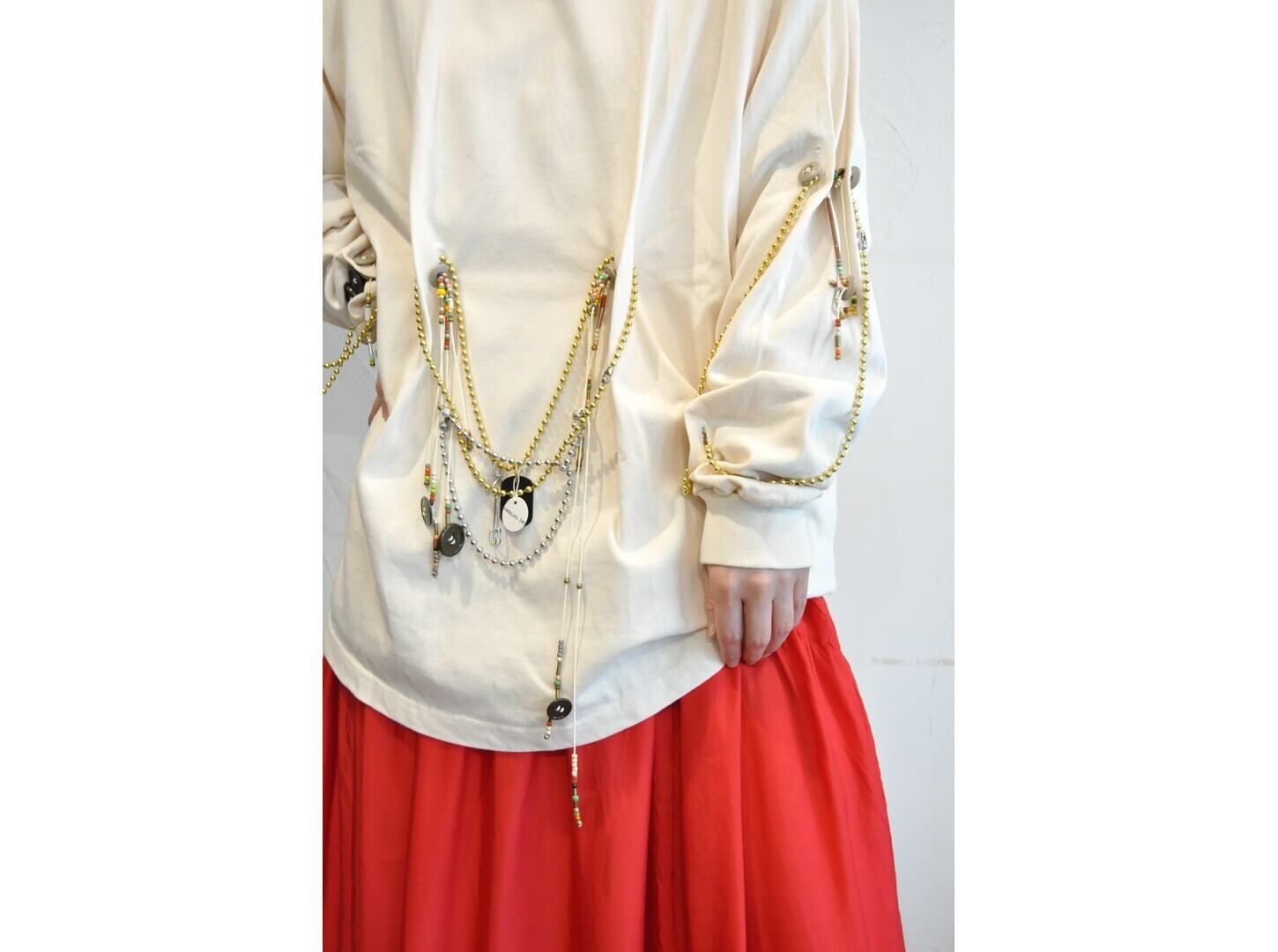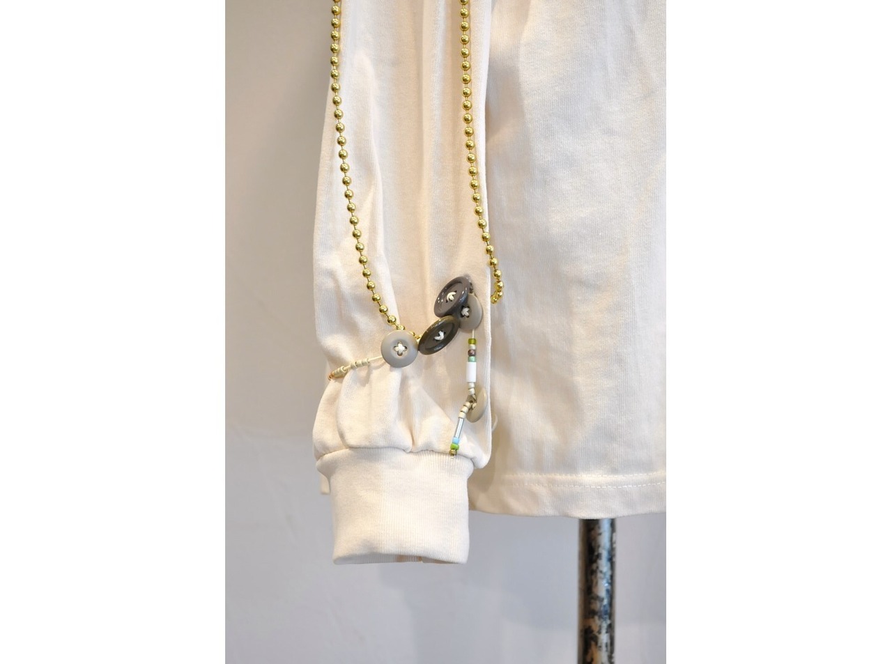 付属に着脱可能な、ヴィンテージのボタンとアンティークビーズ・メタルパーツ等の素材を組み合わせたパーツと、ゴールド&シルバーのボールチェーンで贅沢に装飾した、ハイカスタムデザイン。