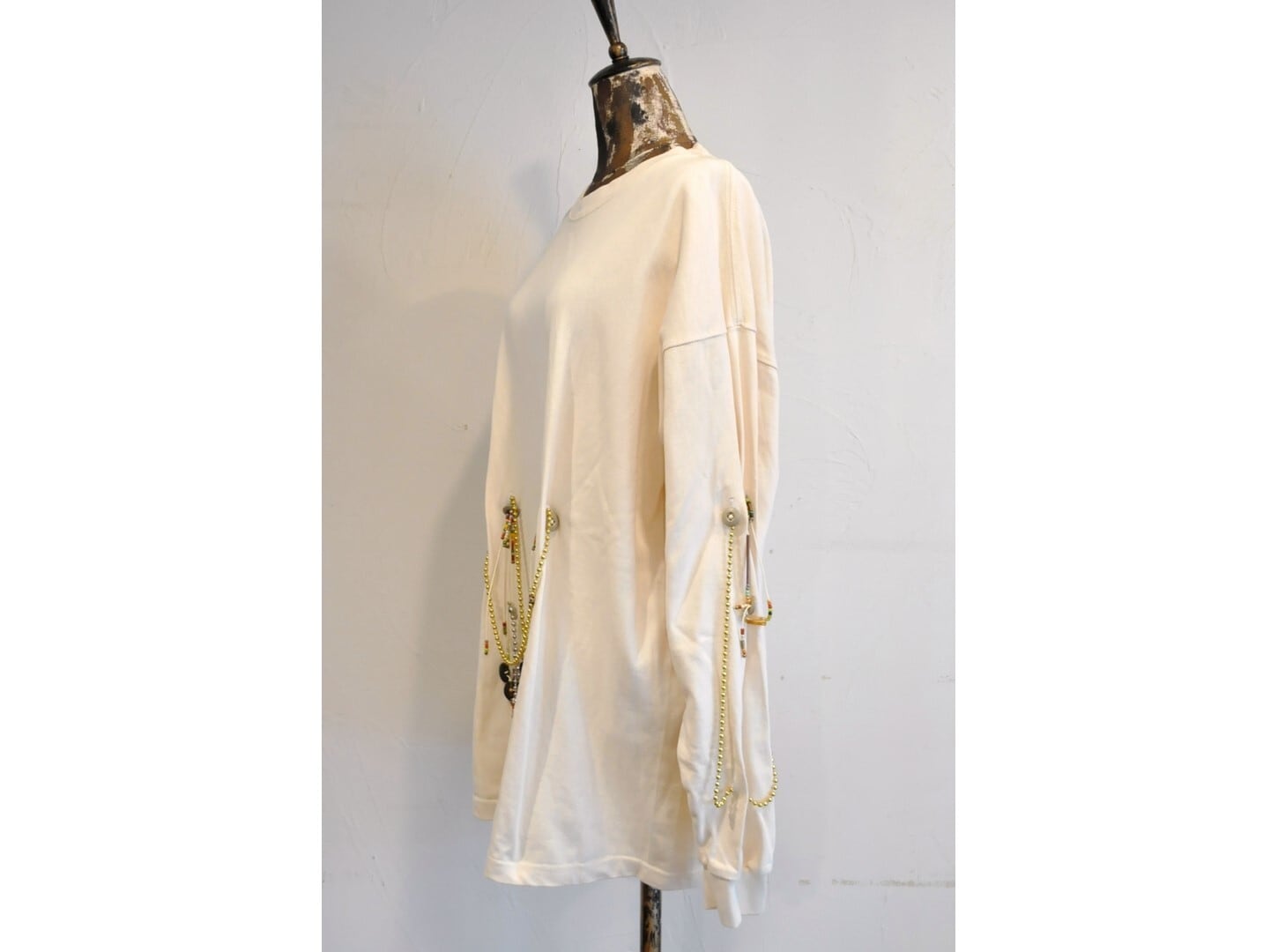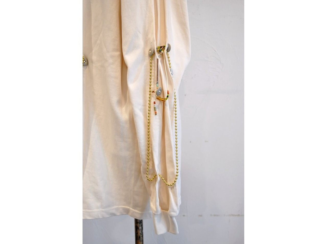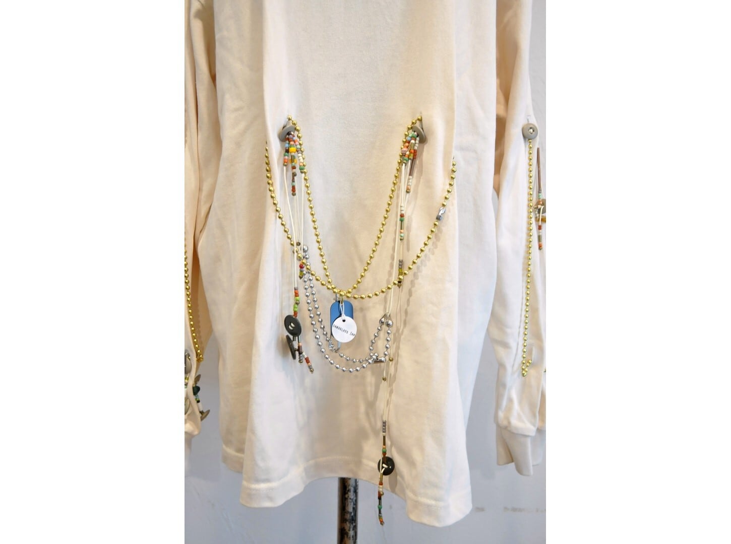 付属に着脱可能な、ヴィンテージのボタンとアンティークビーズ・メタルパーツ等の素材を組み合わせたパーツと、ゴールド&シルバーのボールチェーンで贅沢に装飾した、ハイカスタムデザイン。