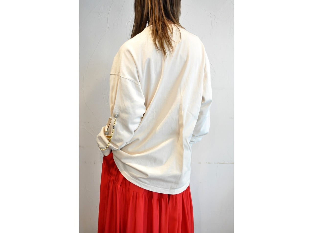 フロントに2つ・バックに1つ・両袖に各3つ、大きなボタンホールを施したビッグロンT。