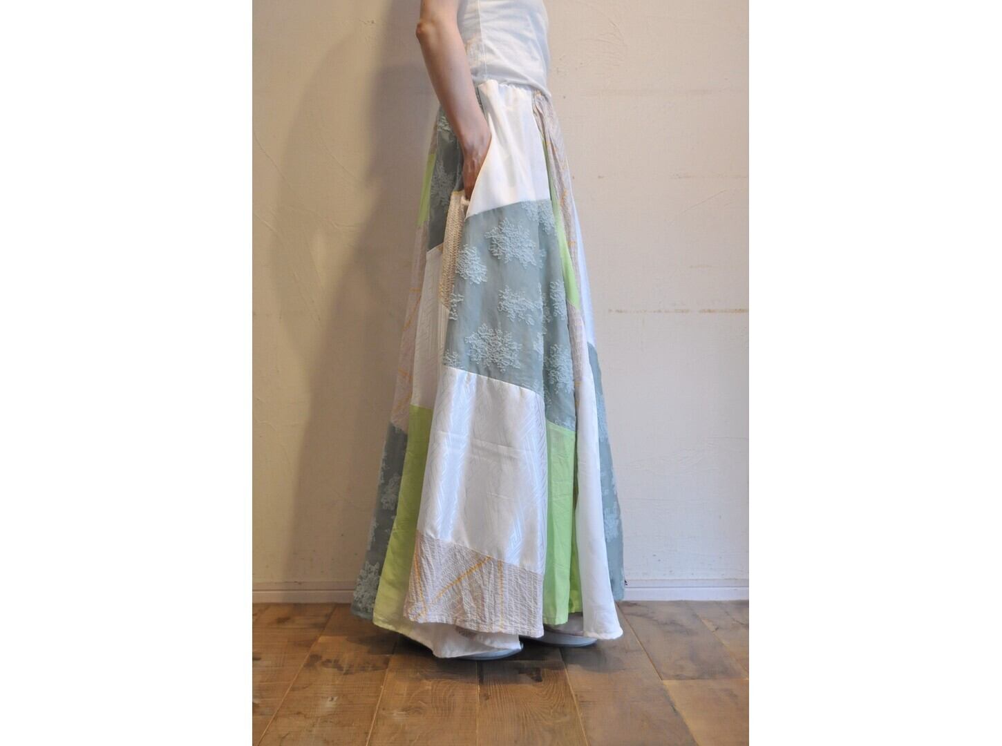 ユーズドの着物を使用し、数種類の素材の異なる生地をパッチワークで組み合わせたロングスカート。